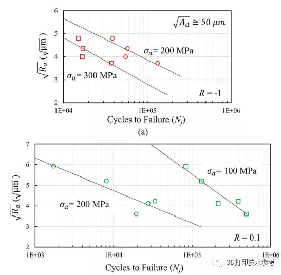SLM制造的Ti6Al4V在幾種應(yīng)力水平下,疲勞壽命與測(cè)得的Ra的平方根之間的相關(guān)性:(a)R=-1載荷,(b)R = 0.1載荷